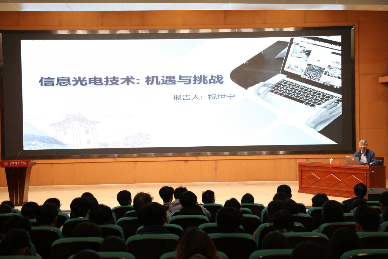 10月18日,物电学院关工委邀请中国科学院院士、南京大学教授祝世宁作题为《光电科技:机遇与挑战》的学术报告。物电学院院长、关工委主任李清波及部分师生参加学术报告会。